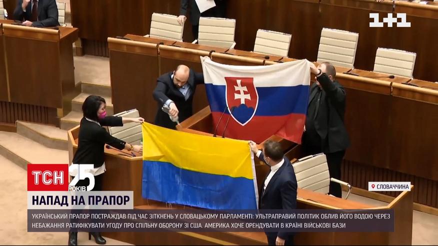 Під час сутички у словацькому парламенті ультраправий депутат облив український стяг водою. Наш прапор словацькі депутати розмістили на знак підтримки України на тлі російської агресії. Її наслідки саме обговорювали у парламенті - там мають ратифікувати угоду про оборону, яка дозволить США орендувати в Словаччині дві військові бази на 10 років. Це принесе країні сто мільйонів доларів на модернізацію баз. Угоду підтримує частина депутатів і президентка. Однак, дехто з політиків вважає, що договір з Америкою розгніває Москву і поставить під загрозу суверенітет країни.