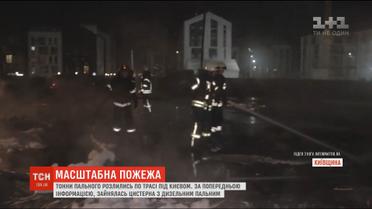 Тонни палива розлились по трасі. Під Києвом сталась масштабна пожежа на кустарній автозаправній станції. За попередньою інформацією, горіло дизельне паливо. Пожежа почалась у цистерні, де воно зберігалось. Потім паливо витекло на проїжджу частину й розтеклось околицями.