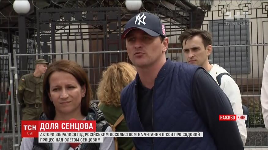 Кіно,- і театральна спільнота України називає свою акцію перформансом. Учасники не чекають жодної реакції від посольства. Творча еліта України мусить реагувати на такі речі, як арешт Олега Сенцова, тому що це неприпустимо у 21 столітті, зауважив головний актор фільму "Кіборги".