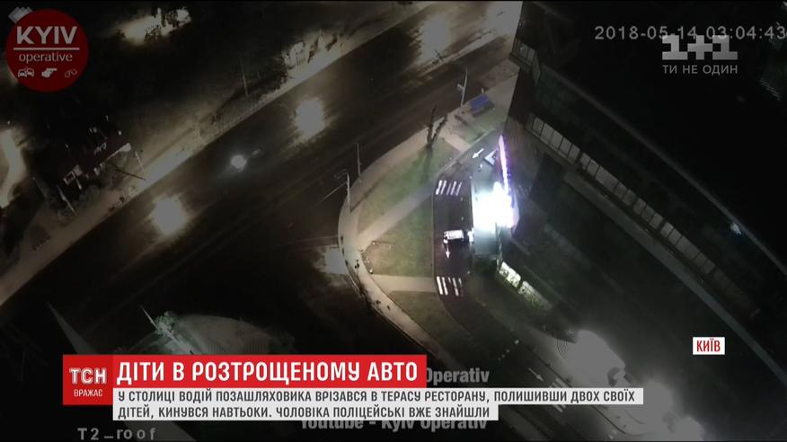 У Києві джип врізався у терасу ресторану. За кілька секунд після трощі водій вибіг з позашляховика і кинувся навтьоки. Поліцейські, які підбігли за півхвилини, побачили у салоні двох неповнолітніх дітей з легкими ушкодженнями. Втікача вже знайшли та відпустили.