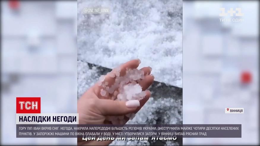 Травневий снігопад. Карпати напередодні присипало снігом. Водночас температура там була із позначкою плюс. Більшість регіонів України накрили грози з градом - без світла нині чотири десятки населених пунктів в трьох областях. У Запоріжжі залило середмістя - автівки буквально плавали по вікна у воді. Потужна злива накрила і Вінницю. Негода налетіла раптово, за лічені хвилини вулиці перетворились на ріки. Град був такий рясний, що вкрив землю шаром.