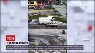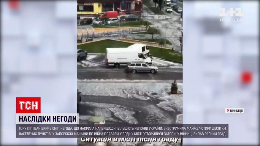 Мокро, холодно, навіть сніжно. Так в Україні починається літо. У Карпатах - сніг, водночас температура там була із позначкою плюс. Більшість регіонів України накрили грози з градом - без світла нині 4 десятки населених пунктів в трьох областях. Зокрема, у Запоріжжі залило середмістя - автівки буквально плавали по вікна у воді. Потужна злива накрила вчора і Вінницю. Негода налетіла раптово, за лічені хвилини вулиці перетворились на ріки та посипав град.