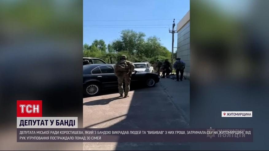 Депутата, який з бандою викрадав людей та "вибивав" з них гроші затримала СБУ на Житомирщині. Від рук угрупування постраждало понад 30 сімей. Зловмисники вимагали кошти під вигаданими приводами, кажуть в службі безпеки, а у разі відмови платити викрадали своїх жертв та відвозили до спеціально облаштованих катівень. Серед потерпілих - військовослужбовець ЗСУ. Його вагітну дружину зловмисники погрожували покалічити, а потім вбити, якщо не передасть 190 тисяч гривень. У ході спецоперації у серпні та вересні правоохоронці затримали десятьох учасників банди. Нині ж встановили причетність до злочинного угрупування депутата міськради Коростишева, який раніше обіймав посаду віцемера міста. Він змушував потерпілих приносити «відкупні» у міськраду. А ще застерігав не звертатися до поліції, бо, мовляв, всюди має зв‘язки. Підозрюваному загрожує до 7 років за гратами. Деталі - в ТСН.