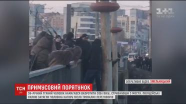 Житель Хмельницького пручався й відбивався, коли копи намагалися врятувати йому життя. Чоловік хотів стрибнути з мосту в річку в середмісті в обідню пору. Незважаючи на його супротив, копи силою витягли потенційного самогубцю з підмостку нагору. Під час переговорів вдалося дізнатися - чоловік - батько трьох дітей.