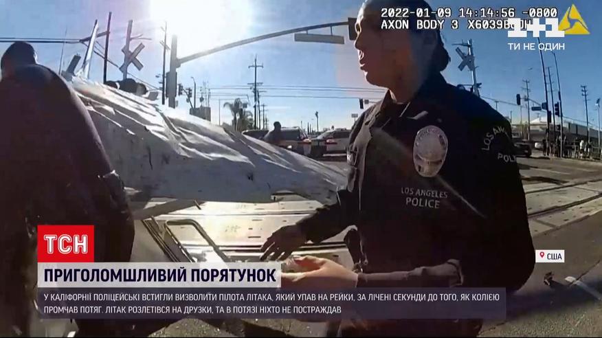 Американські поліцейські встигли визволити пілота літака, який упав на рейки, за лічені секунди до того, як колією промчав потяг. Інцидент стався у Каліфорнії: легко-моторний літак зазнав аварії незабаром після злету. На відео з місця події видно, що у пілота скривавлена голова. На допомогу йому прийшли поліцейські: вони встигли витягнути чоловіка з кабіни і перенести на безпечну відстань, як колією промчав поїзд. Літак розлетівся на друзки, утім, у потязі ніхто не постраждав. Пілота ж доправили до шпиталю.