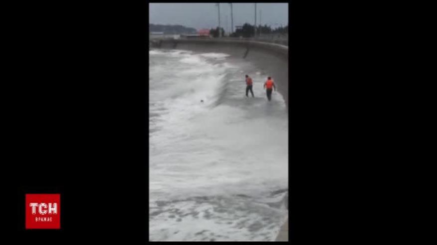 На сході Китаю у провінції Шаньдун чоловік, випивши алкоголю, вирішив скупатися. Потужні хвилі могли поглинути його у будь-який момент. Поліцейським у рятувальних жилетах знадобилося щонайменше півгодини, аби витягти чоловіка на берег.