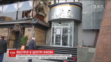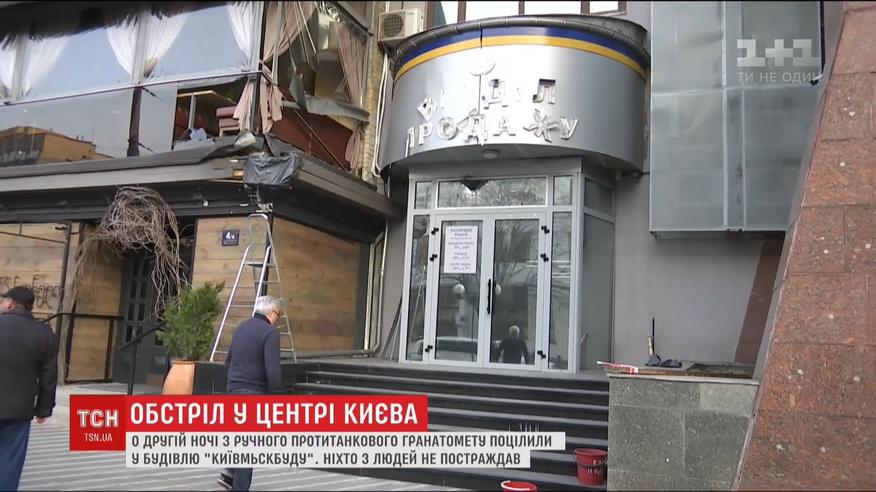 "Київміськбуд" - всього за пару кілометрів від Верховної Ради. Всю ніч там працювали правоохоронці. В цій же будівлі знаходиться і офіс громадського телебачення. Вибухом в будівлі пошкоджений відділ продажів та ресторан. Тубус гранатомета зі спиляним номером знайшли неподалік.