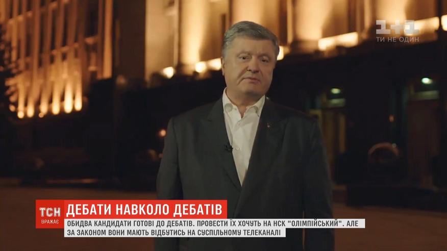 У соцмережах уже тиждень тривають дебати довкола дебатів Порошенка і Зеленського. Кандидати влаштували двобій відеороликами. Зеленський запропонував провести словесний двобій на стадіоні. У Порошенка відповіли: готові хоч на стадіон, хоч у студію Суспільного. ЦВК раніше роз'яснювала, що дебати, оплачені державним коштом, мають проходити на Суспільному телеканалі, інші варіанти кандидати повинні оплачувати зі своєї кишені.