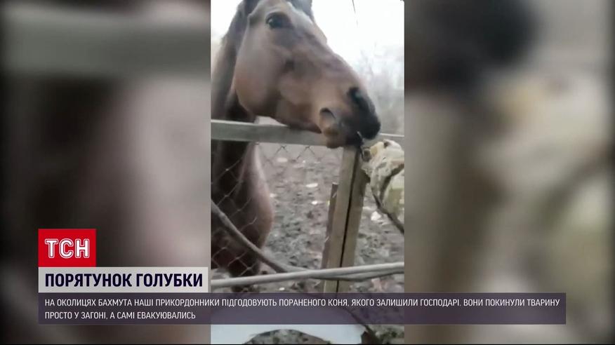 На околицях Бахмута прикордонники виходжують конячку, яку залишили господарі. Вони покинули тварину просто у загоні, а самі евакуювались. Кобилу поранило осколками. Прикордонники, як тільки її знайшли, відвели у безпечне місце і тепер кілька разів на день підгодовують. Рани, кажуть військові, поступово загоюються, Голубка має гарний вигляд і хороший апетит. Годують свою підопічну печивом та яблуками. От тільки як з нею бути далі, прикордонники не знають.
