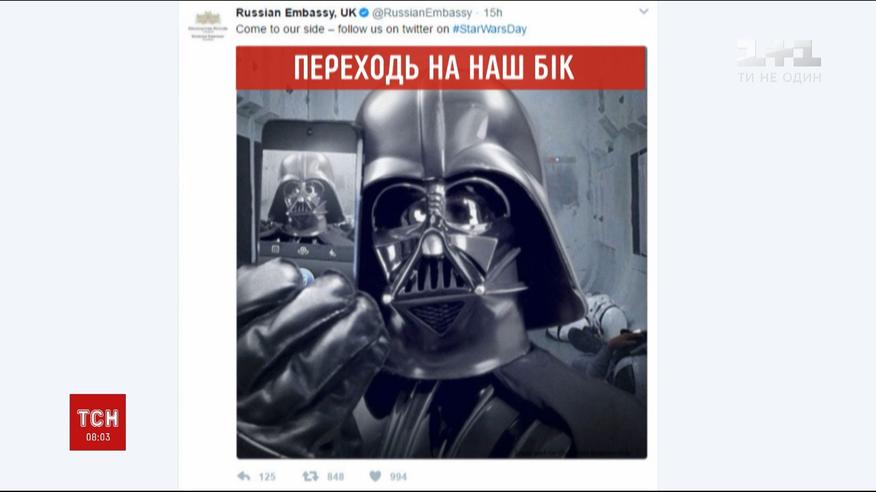 Російські дипломати у Великій Британії зобразили себе в образі головного негідника із кіносаги "Зоряні війни". Відповідний пост дипустанова розмістила в соціальній мережі. Посольство - закликало користувачів підписуватися на свою сторінку та переходити на їхній бік.