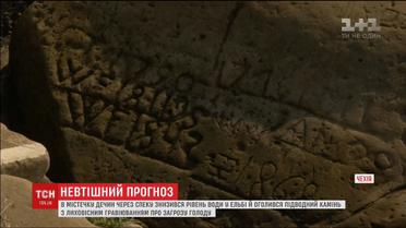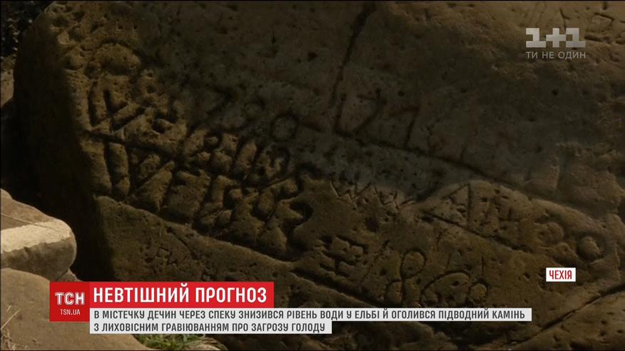 "Якщо бачиш мене, чекай лиха" – посуха у Чехії розкрила давні послання. На півночі країни в містечку Дечин через спеку різко опустився рівень води на Ельбі. І тепер можна побачити велетенський, як його називають чехи, камінь голоду з лиховісним гравіюванням. Його зробили ще на початку минулого сторіччя. Місцеві кажуть - послання означає, що найближчим часом доведеться пережити скрутні часи та поганий урожай.