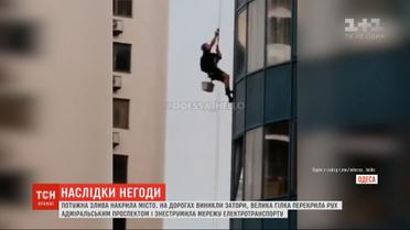 Потужний дощ накрив Одесу. Спочатку місто скували затори, згодом взагалі зупинилися тролейбуси кількох міських маршрутів. Через сильний вітер велетенська гілка впала на дорогу, заблокувала дорожній рух та знеструмила контактну мережу електротранспорту. А от відпочивальникам дощ зіпсував похід на море. Потоки води залили пляжі. А в Аркадії ледве не сталося трагедії - потужна злива заскочила мийника вікон за роботою. Чоловік був на рівні 12 поверху і мокрим канатом не міг вилізти нагору. Щохвилини ризикував впасти вниз, аж поки напарник спустив суху мотузку. Порятунок зафільмував свідок із сусіднього будинку.