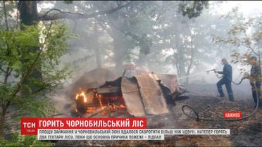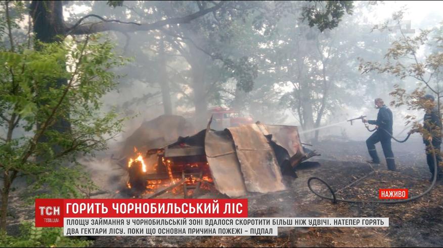 За ніч рятувальникам вдалося побороти вогонь на половині площі загоряння - це 5 з 10 гектарів території, що палала напередодні. Пожежа почалась минулої доби, нині в Чорнобилі працюють півтори сотні рятувальників та задіяна авіація. Є версія, що це був підпал, адже ліс загорівся одразу в кількох місцях. Там ніби знайшли предмети, схожі на смолоскипи.