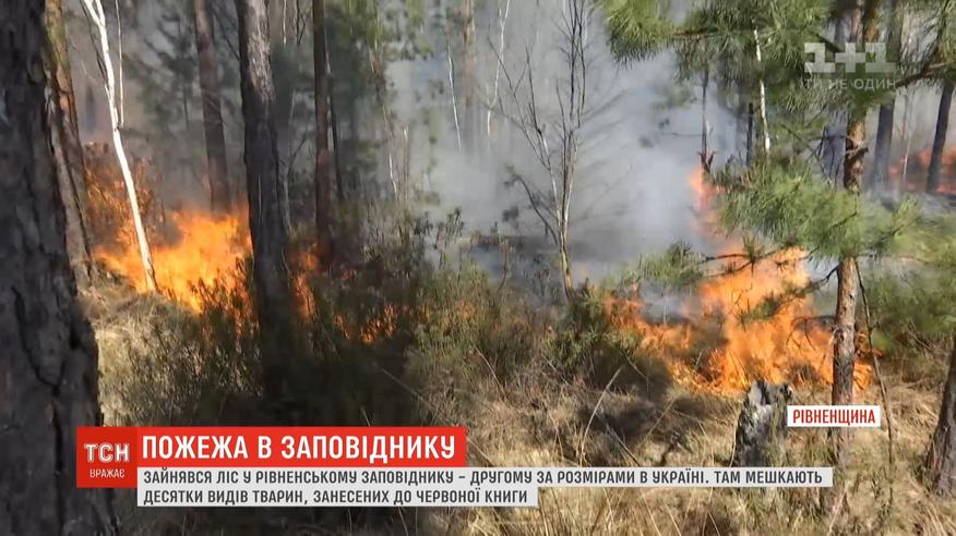 Вогонь зупинили у Рівненському заповіднику: в Україні він другий за розмірами після Кримського. Ліс із тваринами, що входять до Червоної книги, запалав удень. За попередніми даними, вигоріло щонайменше 2 гектари лісового масиву.