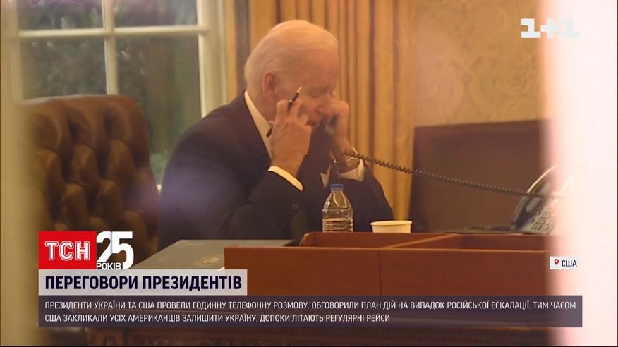 Президенти України та США напередодні провели годинну телефонну розмову. Обговорили план дій на випадок ескалації. Володимир Зеленський запевнив - у Києві усвідомлюють ризики, покладаються на українські Збройні сили і готові до будь-якого розвитку подій. І - запросив американського колегу найближчими днями відвідати Київ. Що на це відповів Джо Байден - і яку допомогу США готові надати у разі вторгнення – у сюжеті.