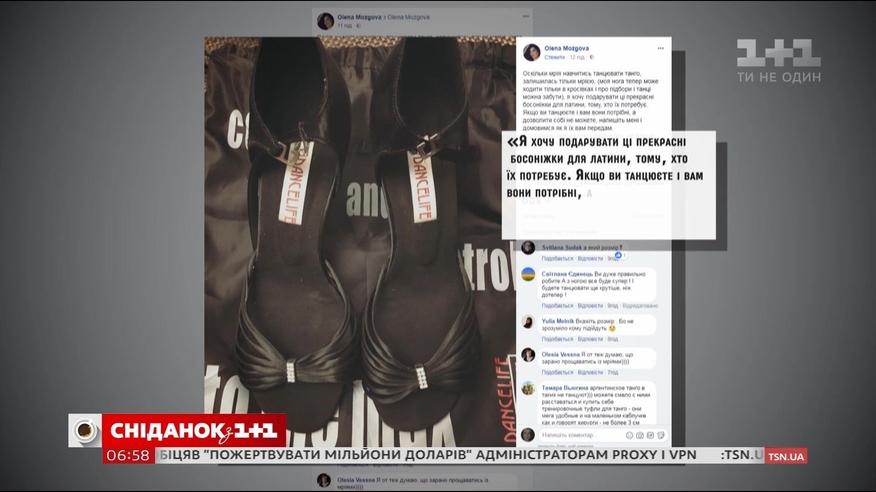 Продюсерка Олена Мозгова виставила на подарунок на своїй сторінці у Фейсбуці власне взуття. Чорні босоніжки 39 розміру на підборах з маленькими камінчиками. Майже нові, купила у магазині все для танцю за 2600 грн. Каже вдягала лише 5 разів, не більше.