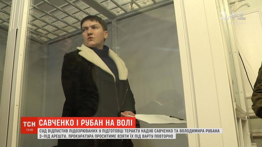 Суд відпустив підозрюваних у підготовці масового теракту, оскільки термін їхнього арешту сплинув, а нового клопотання від прокурорів про продовження запобіжного заходу не надійшло. За гратами Надія Савченко та Володимир Рубан провели понад рік. Їм інкримінують вчинення дій з метою насильницького повалення конституційного ладу. Слідчі доводять, що Рубан намагався ввезти зброю з окупованого Донбасу, яку Савченко потім мала використати для теракту під куполом Верховної Ради.