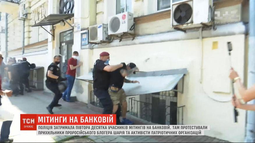 Сутички, фаєри, сльозогінний газ: поліція затримала 15 учасників мітингів на Банковій. Відранку там зібралися прихильники проросійського блогера Шарія. Пізніше туди ж рушили активісти патріотичних організацій: Демсокири, Руху ветеранів України та інші. "Шаріївці" вимагали зустрічі із Зеленським, а представники націоналістичних організацій прийшли висловити своє обурення проросійською позицією опонентів. Дійшло до сутичок. В хід пішов сльозогінний газ. Затриманих доправили до відділку, порушено кримінальну справу.