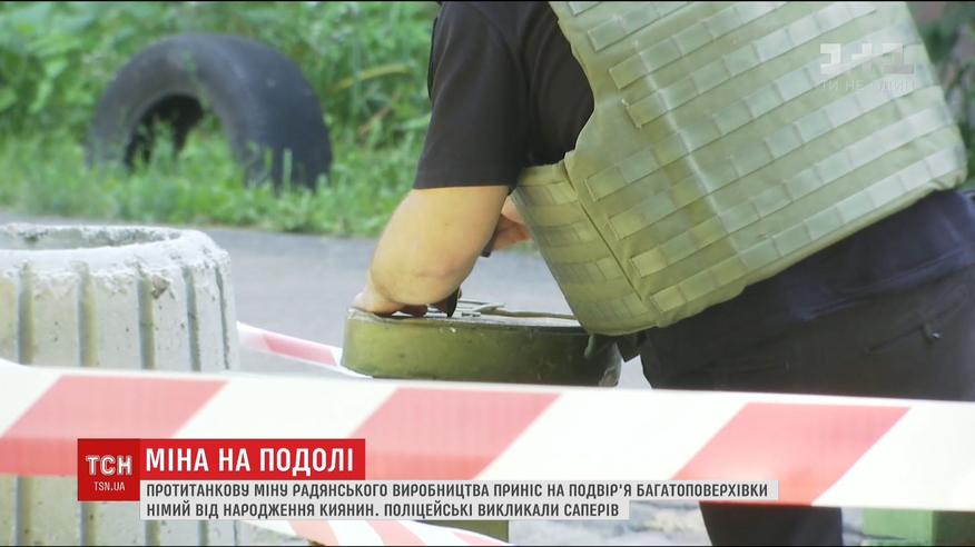 Протитанкова міна посеред Києва. Правоохоронці перекрили сьогодні частину житлового двору на столичному Подолі. Місцевий мешканець знайшов потужну протитанкову міну радянського виробництва і притягнув її у двір багатоповерхівки, де гуляють батьки з дітьми. Це стара ТМ-57, в якій тротилу - 6,5 кг. Поліцейські викликали саперів. Тепер для правоохоронців складне завдання дізнатися звідки взялася ця міна. Чоловік, який її приніс, від народження німий, спілкується жестами.