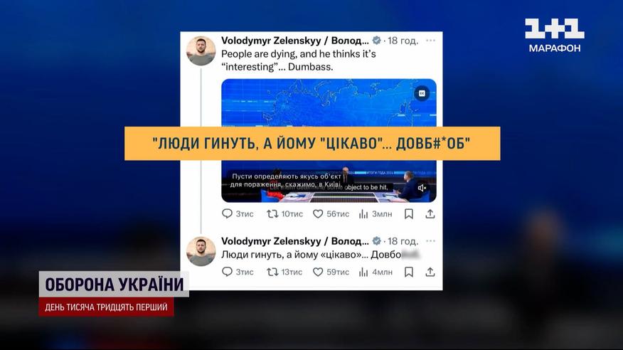 Нові епітети для кремлівського ката. Володимир Зеленський назвав Путіна "відморозком" після його слів про "удар Орєшніком по Києву". Ще більш емоційним президент був у соцмережах. Там він себе не стримував, характеризуючи диктатора... Чи порушує це дипломатичний протокол? І як на це відреагували українці? Не всі слова з цього сюжету можна озвучити в ефірі, отже кореспондентка ТСН Карина Вакарєва час від часу запікуватиме дуже влучні, але не надто цензурні цитати.