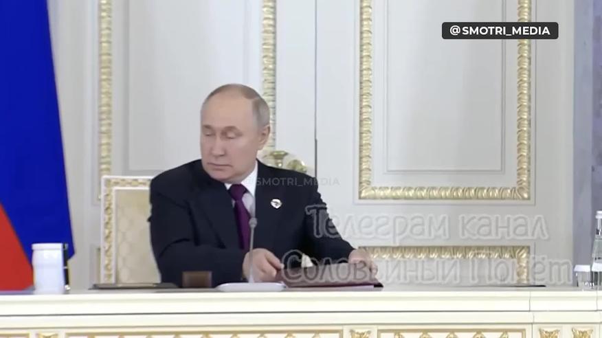 На опублікованих кадрах видно, як Путін сидить за столом і тримає товсту теку. Обличчя Путіна змінюється десятки разів упродовж лише кількох секунд. На ньому читається і роздратування, і огида, потім задоволення і дивна усмішка. Далі очільник Кремля намагається підняти теку зі столу й комусь передати, але це йому вдається не з першого разу.