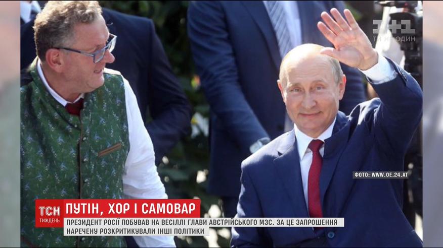 На своє свято Путіна запросила глава МЗС Австрії - 53-річна Карін Кнайсль. Наречену за це запрошення критикували інші політики. І навіть закликали подати у відставку. Через запізнення російського лідера весільну церемонію затримали, а заради кортежу перекрили ціле шосе і задіяли півтисячі правоохоронців. Очільник Кремля подарував молодятам картину олійними фарбами з сільськими мотивами, старовинний олійний прес і тульський самовар.