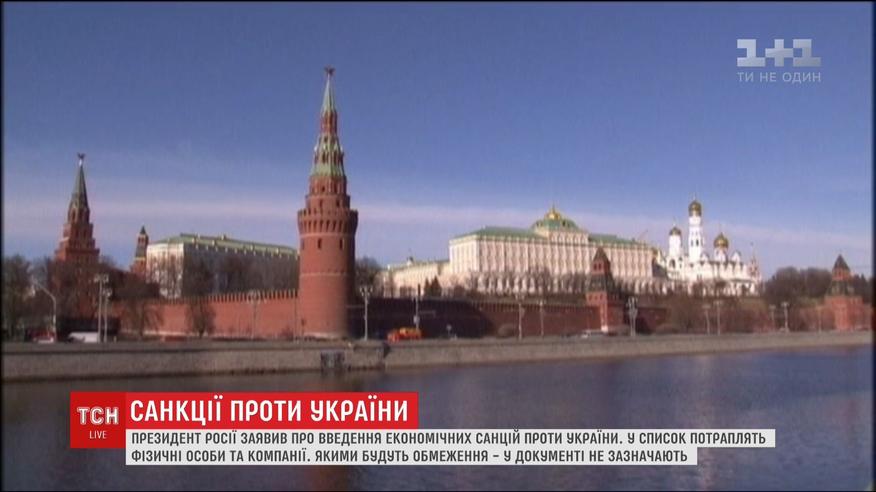 Володимир Путін запровадив економічні санкції проти України. Відповідний указ опублікований на сайті президента. Мовляв, із метою захисту національних інтересів. Рішення Москва прийняла у відповідь на антиросійські санкції, прийняті Києвом. У Кремлі ці дії назвали такими, що протирічать міжнародному праву.