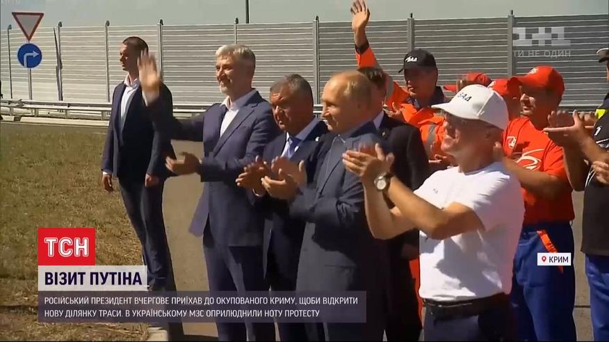 Російський очільник незаконно приїхав у анексований Крим відкривати дорогу, що веде від Керченського мосту до Севастополя. В українському МЗС обурені приїздом кремлівського керманича до українського півострова і вже оприлюднили ноту протесту. У ній візит Путіна називають цинічним та демонстративним нехтуванням міжнародного права.