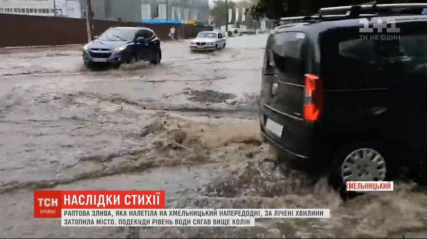 Гроза налетіла на Хмельницький раптово, вчора по обіді. За лічені хвилини води налило стільки, що автівки пливли наче човни. Зливова каналізація не встигала справлятись з потоками, подекуди рівень води сягав вище колін. Підтопило і продовольчий ринок, продавці поспіхом закривали ятки із товаром. Пливе Хмельницький щоразу під час рясних дощів, проблема у старій системі водовідведення.