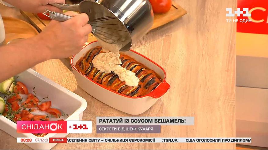 Сьогодні вівторок, а це означає, що в нас за розкладом - урок від шефа. Євген Клопотенко – як головний реформатор кулінарної освіти в Україні – не лише ділиться з нами рецептами смачних страв, а й вчить нас готувати їх правильно та майстерно. Готуємо кашу з пшениці і рататуй з соусом бешамель. Каша з пшениці: пшениця - 60 г, вода - 108 мл, вершкове масло - 3г. Рататуй: кабачок - 1 шт., цукіні - 1 шт., баклажан - 1 шт., томат - 10 шт., червоний солодкий перець - 1 шт., чебрець - 3 гілочки, рослинна олія - 5 ст. л., сіль та перець. Соус бешамель: молоко - 500 мл, вершкове масло - 50 г, борошно - 50 г, мускатний горіх.