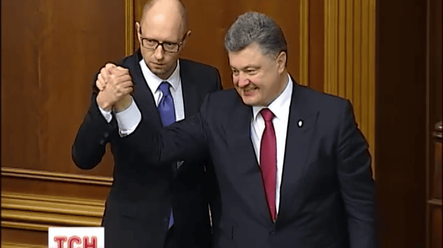 До неї увійшли 302 проєвропейськи налаштованих депутати, утворивши конституційну більшість. Щоб продемонструвати єдність, за руки взялися президент Порошенко, прем’єр Яценюк і спікер Гройсман.