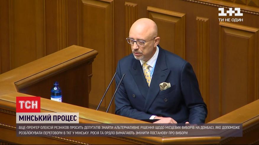 Україна не вноситиме особливий статус Донбасу в Конституцію. У цьому депутатів сьогодні запевнив Олексій Резніков, віце-прем'єр та один із представників України в Тристоронній контактній групі в Мінську. Водночас посадовець просить Верховну Раду знайти альтернативне рішення щодо місцевих виборів, яке допоможе розблокувати переговори з Росією, зокрема, щодо звільнення полонених. Росіяни та підконтрольні їм бойовики в Мінську вимагають змінити постанову про вибори 25 жовтня в частині, яка регламентує умови проведення виборів на нині окупованих територіях Донбасу. Детальніше – у сюжеті.