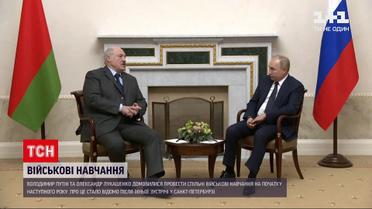 Росія разом із Білоруссю проведе спільні військові навчання на українському кордоні. Про таке Путін з Лукашенком домовилися під час зустрічі у Санкт-Петербурзі. Вишкіл має відбутися на території Білорусі вже на початку наступного року. Точної дати іще не визначили.