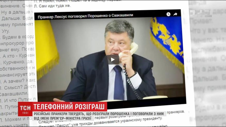 В Інтернет вони виклали запис розмови нібито Петра Порошенко з прем'єр-міністром Грузії Георгієм Квірікашвілі, яким і представився один з пранкерів. Він запитав про ситуацію навколо подій з затриманням Саакашвілі, і людина, голос якої схожий на голос українського президента, розповідає про встановлений зв'язок екс-президента Грузії із Курченко та російськими спецслужбами і про те, що на нього чекає суд.