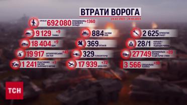 Детально поговоримо про російські втрати на полі бою. А це мінус 1360 бійців, за останню, 978-му добу повномасштабного вторгнення. Загалом же убитими та пораненими росіяни мають 692 тисячі осіб. Техніка ворога: Сили оборони спалили ще 9 танків, 9 бронемашини, 69 військових авто і 45 артустановок. Також від учора збито 72 безпілотника тактичного рівня. Знищених літаків, як і раніше - 369, гелікоптерів - 329. А що ж до морського арсеналу - потоплено 28 кораблів та катерів, 1 субмарину та 1 пором-заправник противника.