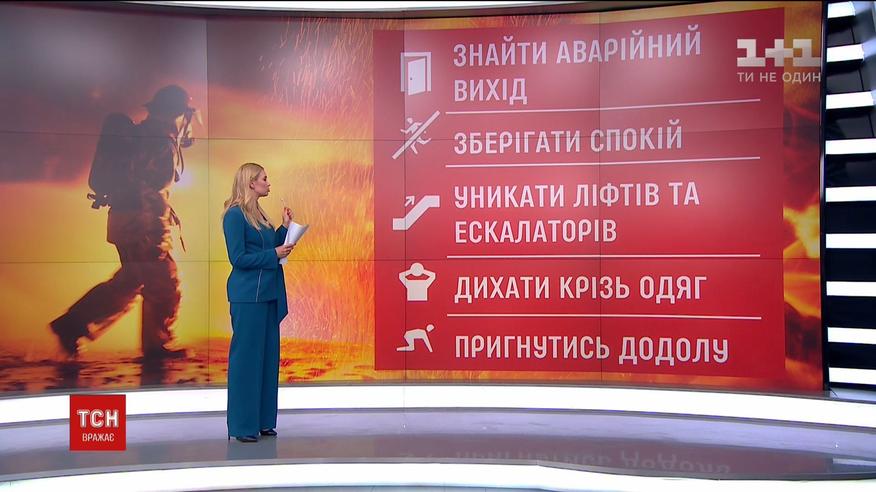 Рятувальники розповіли прості правила, які допоможуть врятуватись під час пожежі в будівлі. Заходячи до будівлі, потрібно запам'ятати, де знаходяться аварійні та звичайні виходи, та звернути на них увагу і дітей. Не потрібно панікувати при оголошені пожежі. Потрібно уникати ліфтів, ескалаторів, а якщо вже опинились у задимленому приміщенні - дихайте крізь одяг.
