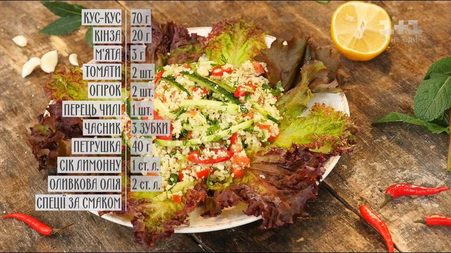 Ця страва родом зі Сходу. Одні називають її закускою, інші - салатом. Але від цього не змінюється її смакові якості. Спробуйте, вам знадобиться: кус-кус - 70 г., кінза - 20 г., м'ята - 3 г, томати - 2 шт., огірок - 2 шт., перець чилі - 1 шт., часник - 3 зубки, петрушка - 40 г, сік лимону - 1 ст. л.,