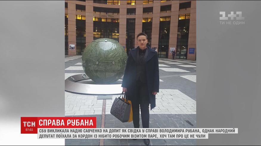 СБУ сьогодні планувала допитати Надію Савченко у справі Володимира Рубана, якого підозрюють у підготовці терактів в урядовому кварталі. Повістку нібито передали в апарат Верховної Ради. Однак, прес-секретар народного депутата заявив, що вона нічого не отримувала і поїхала із робочим візитом до ПАРЄ. Савченко не є офіційним членом української делегації парламентської асамблеї.