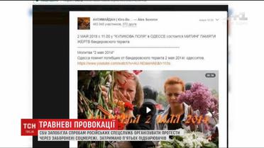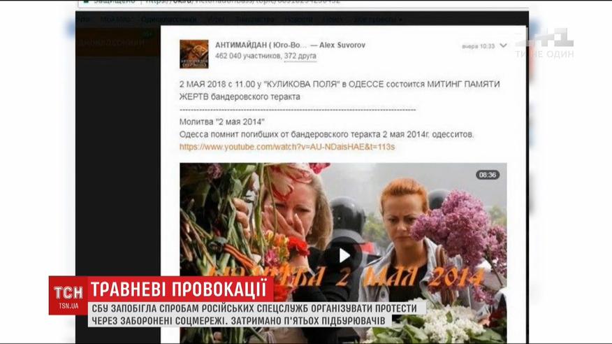 Російські спецслужби вербували українців для організації кривавих провокацій на травневі свята. СБУ затримала двох киян і трьох мешканців Одещини, які на сторінках в заборонених в Україні мережах "ВКонтакте" і "Одноклассники" підбурювали людей у південних та східних регіонах до масових акцій протесту. А також поширювали повідомлення для розпалювання міжнаціональної ворожнечі.