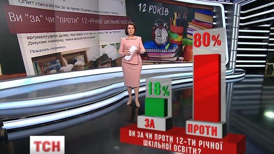 "За" проголосували 18%, проти - 80%. Люди пояснюють свої думки в коментарях. Ірина Рерих пише: "Вчителі зізнаються, що перестали вчити дітей.. перетворились на контролерів.. ". Наталя Москалюк: "12-річне навчання може вплинути тільки на те, що на останньому дзвонику випускниці будуть стояти з колясочками.." Олександра Коваль: "Як випускниця 11 класу, можу впевнено заявити, що навчальна програма дуже складна, великий обсяг інформації неможливо опанувати в такий короткий термін..".
