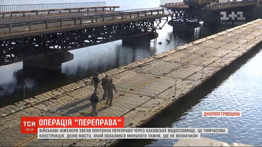 Менше доби знадобилося військовим інженерам, щоб звести понтонну переправу через Каховське водосховище у Дніпропетровській області. Міст обвалився минулого тижня, коли на нього заїхала перевантажена фура. За роботою інженерних військ спостерігала ТСН.