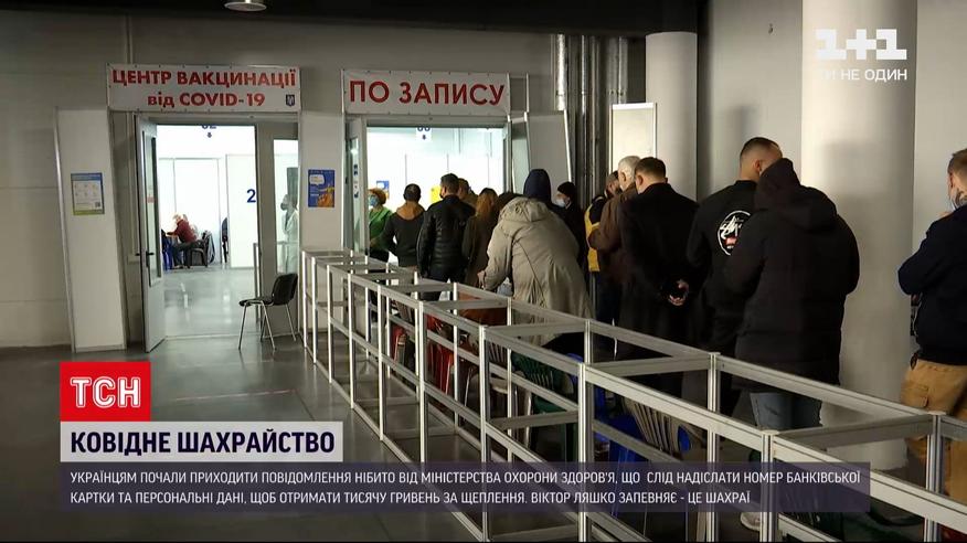 Шахраї намагаються обдурити українців, які прагнуть отримати тисячу гривень за повний курс щеплення. Міністр охорони здоров'я розповів про шахрайську схему: людям, нібито від Міністерства охорони здоров'я, надходять повідомлення, що слід надіслати номер банківської картки та персональні дані, аби отримати тисячу гривень за щеплення.