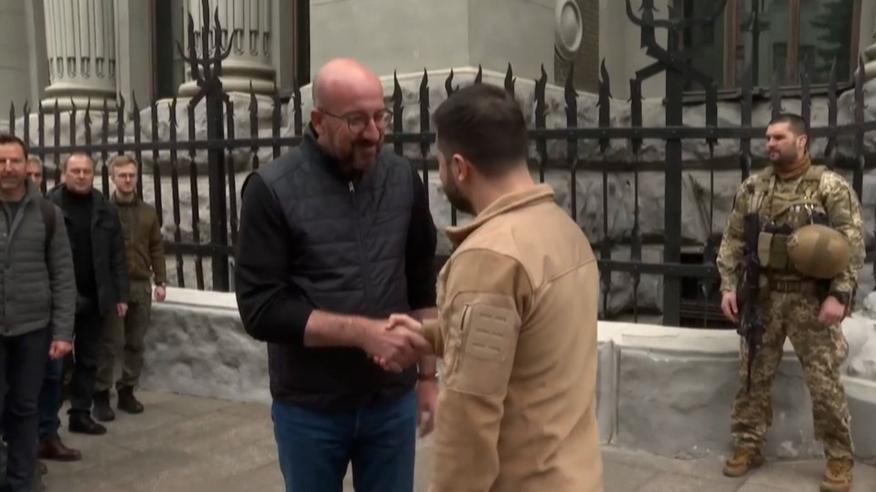 "Президент Європейської ради Шарль Мішель сьогодні у Києві. Обговорили санкції проти Росії, оборонну та фінансову підтримку нашої держави й відповіді для анкети щодо відповідності критеріям ЄС. Дякую за змістовну зустріч і солідарність з народом України!"