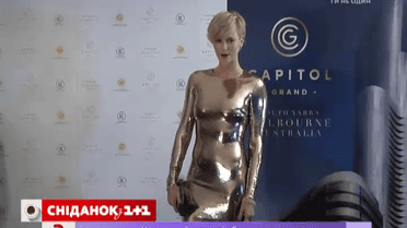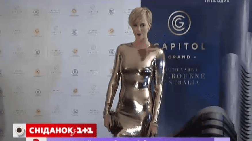 На презентацію нового готельного комплексу у Гонг-Конзі зірка з’явилась у обтислому блискучому вбранні. Складалося враження, що тіло 40-річної актриси облили рідким металом. Насправді золота сукня зірки – це тисячі золотистих блискіток, пришитих до тоненької тканини.
