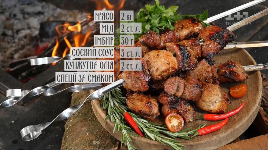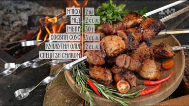У шашлику найголовніше - якість м'яса і маринад. Руслан Сенічкін поділиться власними секретами ідеального шашлику. Вам знадобиться: м'ясо - 2 кг, мед - 2 ст. л., імбир - 30 г, соєвий соус - 3 ст. л., кунжутна олія - 2 ст. л., спеції за смаком.