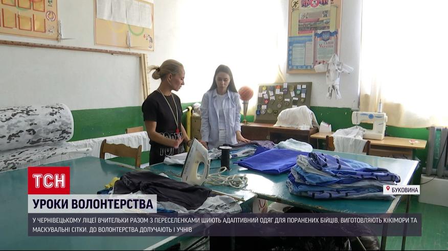 У Чернівцях вчительки разом з переселенками шиють адаптивний одяг для поранених бійців. Шорти та футболки на липучках передають у шпиталі по всій країні. Крім цього, виготовляють кікімори та маскувальні сітки. До волонтерства долучають і учнів. Як один ліцей допомагає захисникам - бачила журналістка ТСН Вікторія Танасійчук.