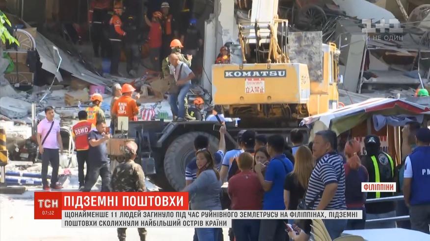 Підземні поштовхи магнітудою у понад шість балів сколихнули найбільший острів країни Лусон. Там обвалилася чотириповерхова будівля торговельного центру. Нині рятувальники розбирають завали, під якими можуть залишатися люди.