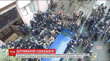 СБУ спільно з Генпрокуратурою о сьомій ранку навідалися з обшуком в помешкання політика. Там же йому оголосили підозру в зв'язках зі злочинними угрупованнями. Проте затримати ж Саакашвілі було дуже не просто. Спочатку він втік на дах. Коли ж силовики повернули грузинського екс-президента на землю і посадили в автобус, транспорт заблокували прихильники політика.