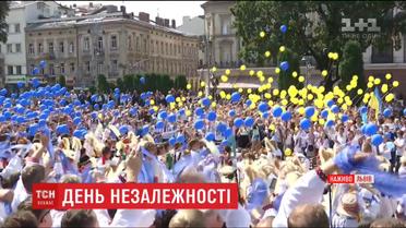 Грали на трембітах, запускали синьо-жовті кульки та згадували важкі події на фронті. Так День незалежності стартував у Львові. Хор із шести сотень голосів відкривав урочисті заходи. На площі біля пам'ятника Шевченку з'явилися десятки прапорів, що прибули сюди із зони бойових дій.