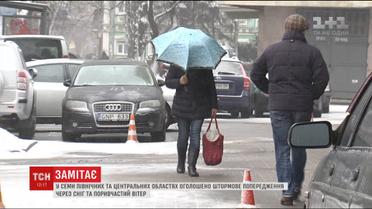 Штормове попередження в 7 областях. Першим циклон із півдня дістався Кіровоградщини. За дві години там випало близько 5 сантиметрів снігу. На деревах - ефектні снігові шапки. У Сумах сніжить від ранку, але комунальники встигають прибирати дороги. Дісталася негода й Києва. Мокрий сніг супроводжує поривчастий вітер.